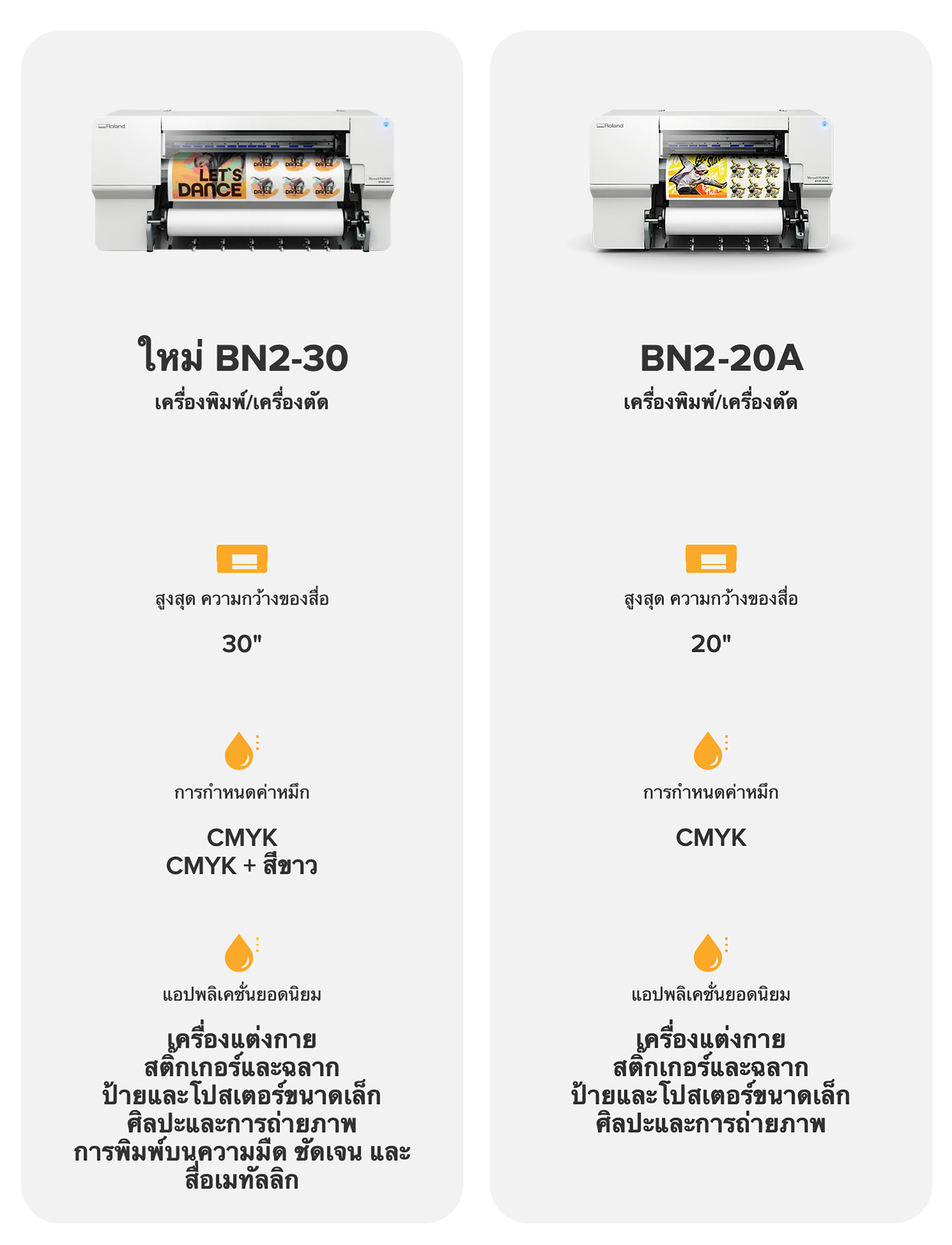 ด้วยความสามารถในการพิมพ์กราฟิกที่สดใสและมีรายละเอียดบนไวนิลฟิล์มวัสดุถ่ายเทความร้อนและสื่อประเภทอื่นๆ BN2-20A และ BN2-30 จึงมีความเก่งกาจที่โดดเด่น ความเข้ากันได้ของสื่อสิ่งพิมพ์นี้รวมกับความเร็วในการพิมพ์ที่เร็วขึ้นฟังก์ชันการพิมพ์ / ตัดในตัวและความสะดวกในการใช้งานที่ไม่มีใครเทียบได้ทําให้อุปกรณ์เดสก์ท็อปที่อัดแน่นไปด้วยคุณค่าเหล่านี้สมบูรณ์แบบสําหรับการใช้งานที่หลากหลาย BN2 Series ทําให้การสร้างสรรค์ทุกอย่างตั้งแต่เสื้อยืดและเครื่องประดับแบบกําหนดเองไปจนถึงป้าย สติ๊กเกอร์ และการตกแต่งผนังที่สะดุดตาทําได้ง่ายและรวดเร็ว