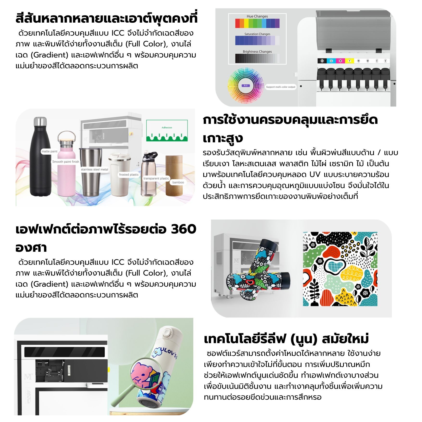 เครื่องพิมพ์ MT-Cylinder Elf ใช้เทคโนโลยี Rotary Printing ที่สามารถพิมพ์รอบวัตถุได้แบบ 360 องศา โดยไม่ทิ้งรอยต่อ จึงเหมาะสำหรับงานพิมพ์บนวัตถุที่มีพื้นผิวโค้งหรือเรียว เช่น กระติกน้ำสุญญากาศ แจกัน หรือขวดแก้วทรงกระบอก ให้ลวดลายต่อเนื่อง สวยงาม เสมือนพิมพ์บนแผ่นเรียบ