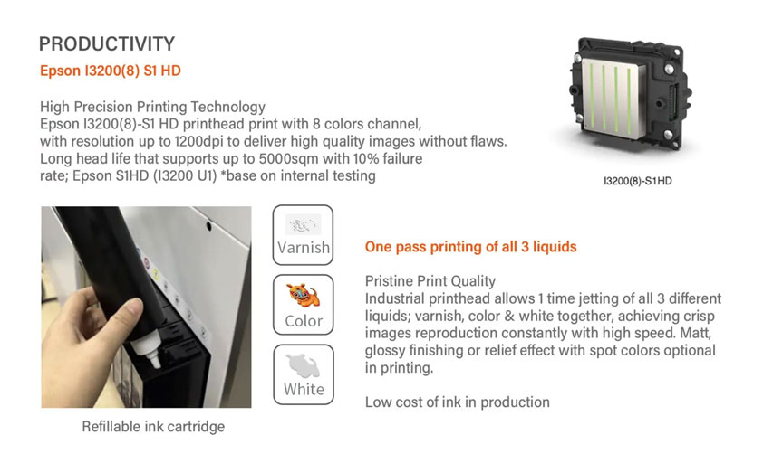 • UV-LED 15-Degree Tilt: การออกแบบหลอด UV ให้เอียง 15 องศา เพื่อป้องกันไม่ให้แสงสะท้อนกลับไปทำลายหัวพิมพ์ขณะพิมพ์วัสดุที่มีความเงาวาว เช่น กระจกหรือสแตนเลส